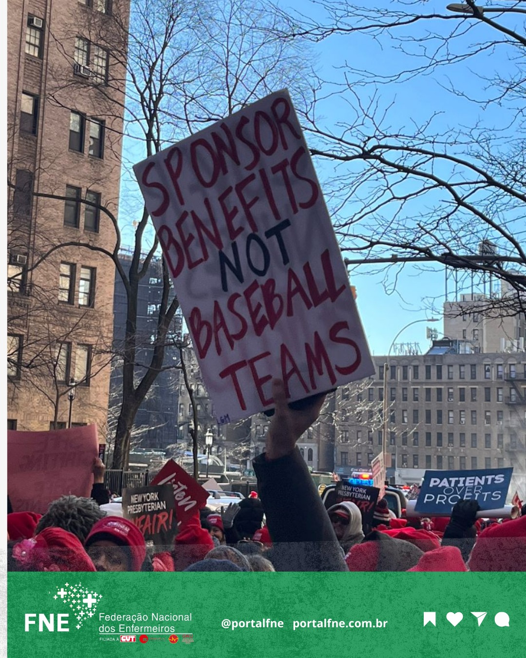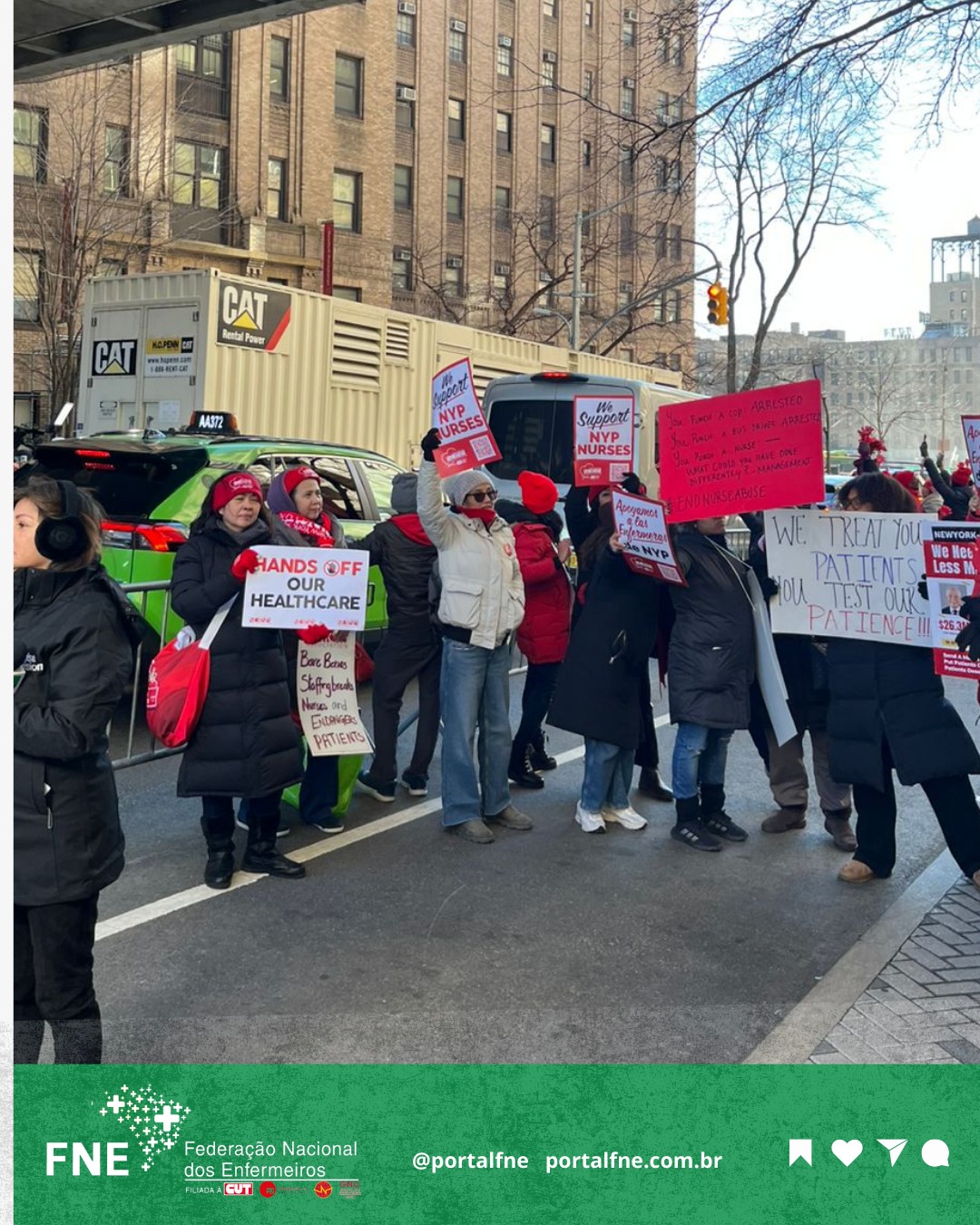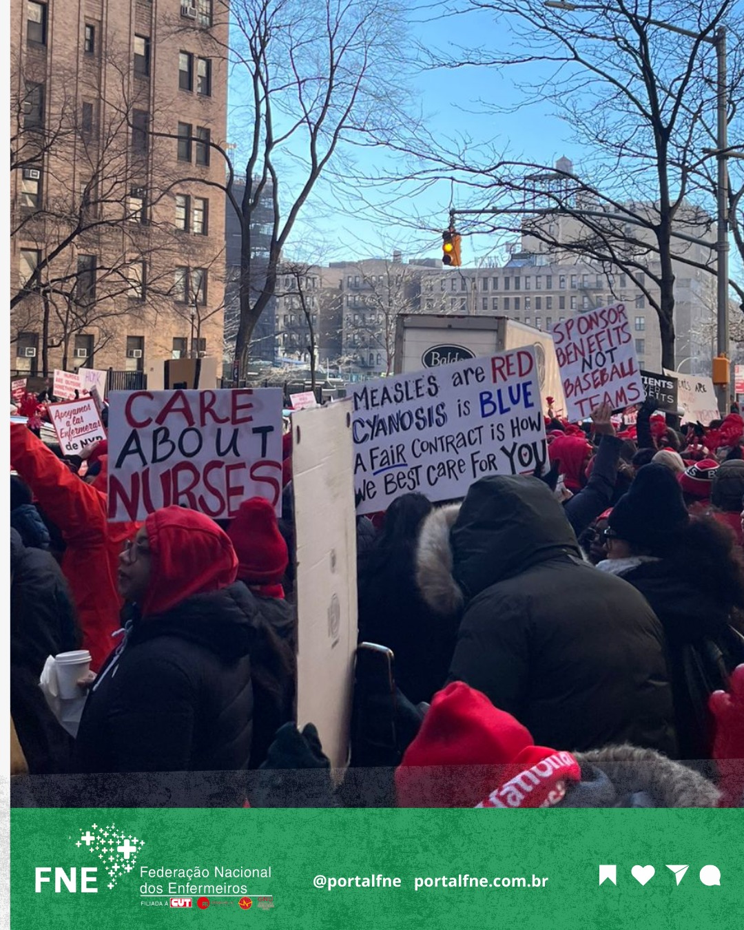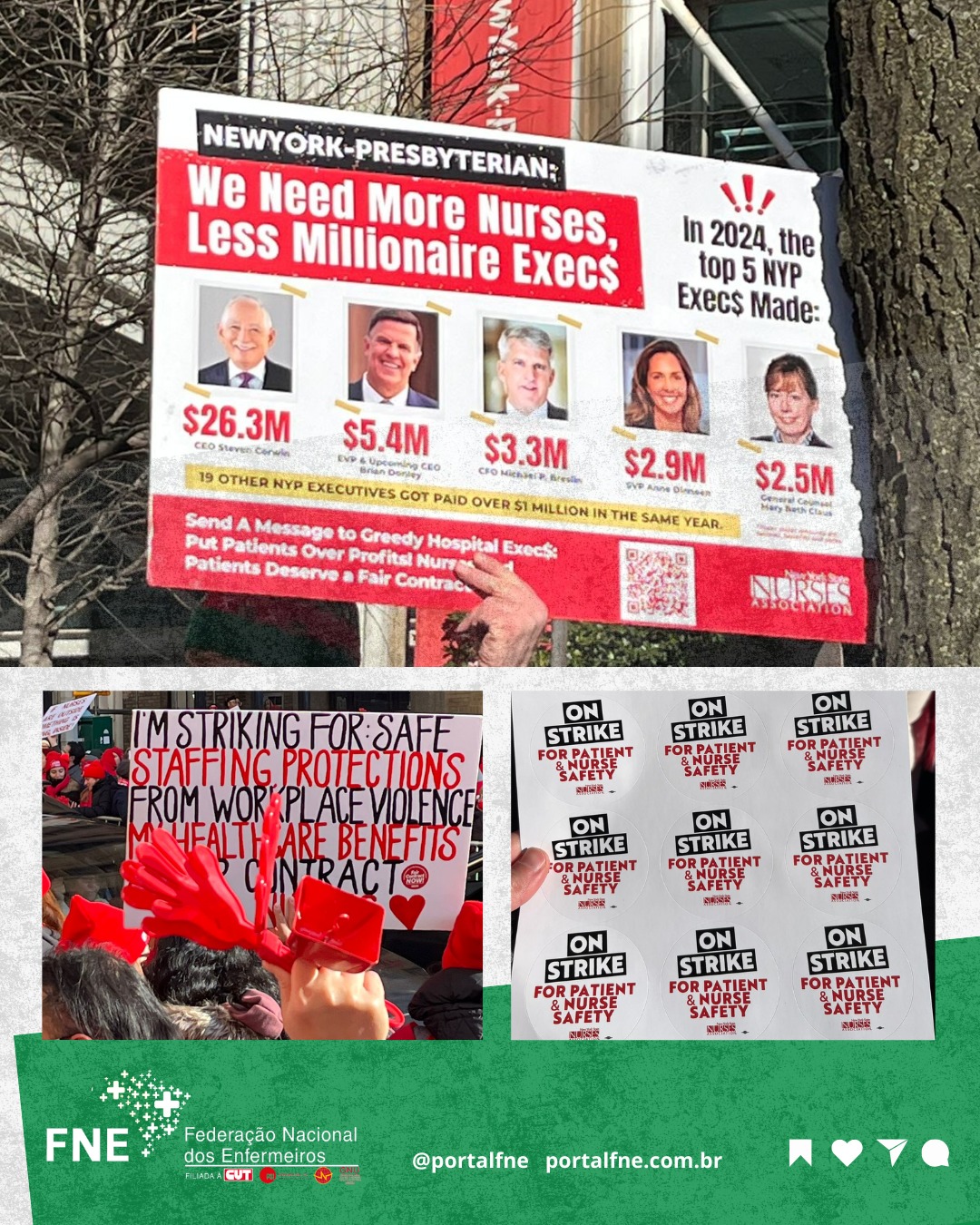 Representados pela Associação de Enfermeiros do Estado de Nova York (NYSNA) - membro da National Nurses United, afiliada à PSI, paralisaram suas atividades e já consolidam a maior greve de enfermeiros da história da cidade de Nova York/EUA, reunindo mais de 15 mil grevistas.